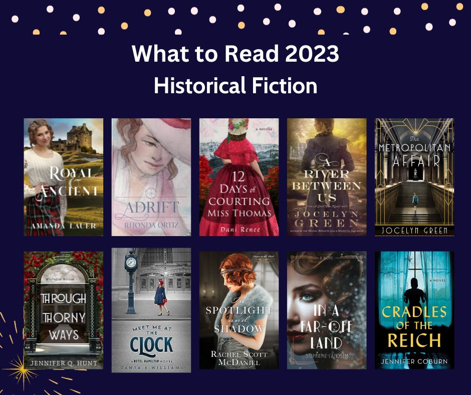1690s Scotland: Royal and Ancient by Amanda Lauer; Post-Revolutionary War: Adrift by Rhonda Ortiz; Pre-Civil War/Antebellum: 12 Days of Courting Miss Thomas by Dani Renee (only available to her newsletter subscribers); Civil War: A River Between Us by Jocelyn Green; 1920s: Meet Me at the Clock by Tanya E. Williams, In Spotlight and Shadow by Rachel Scott McDaniel, The Metropolitan Affair by Jocelyn Green, and Through Thorny Ways by Jennifer Q. Hunt; Great Depression: In a Far-Off Land by Stephanie Landsem; World War II Germany: Cradles of the Reich by Jennifer Coburn. Note: Due to the nature of the story, Cradles of the Reich is not a clean read, but I found it to be thought-provoking.